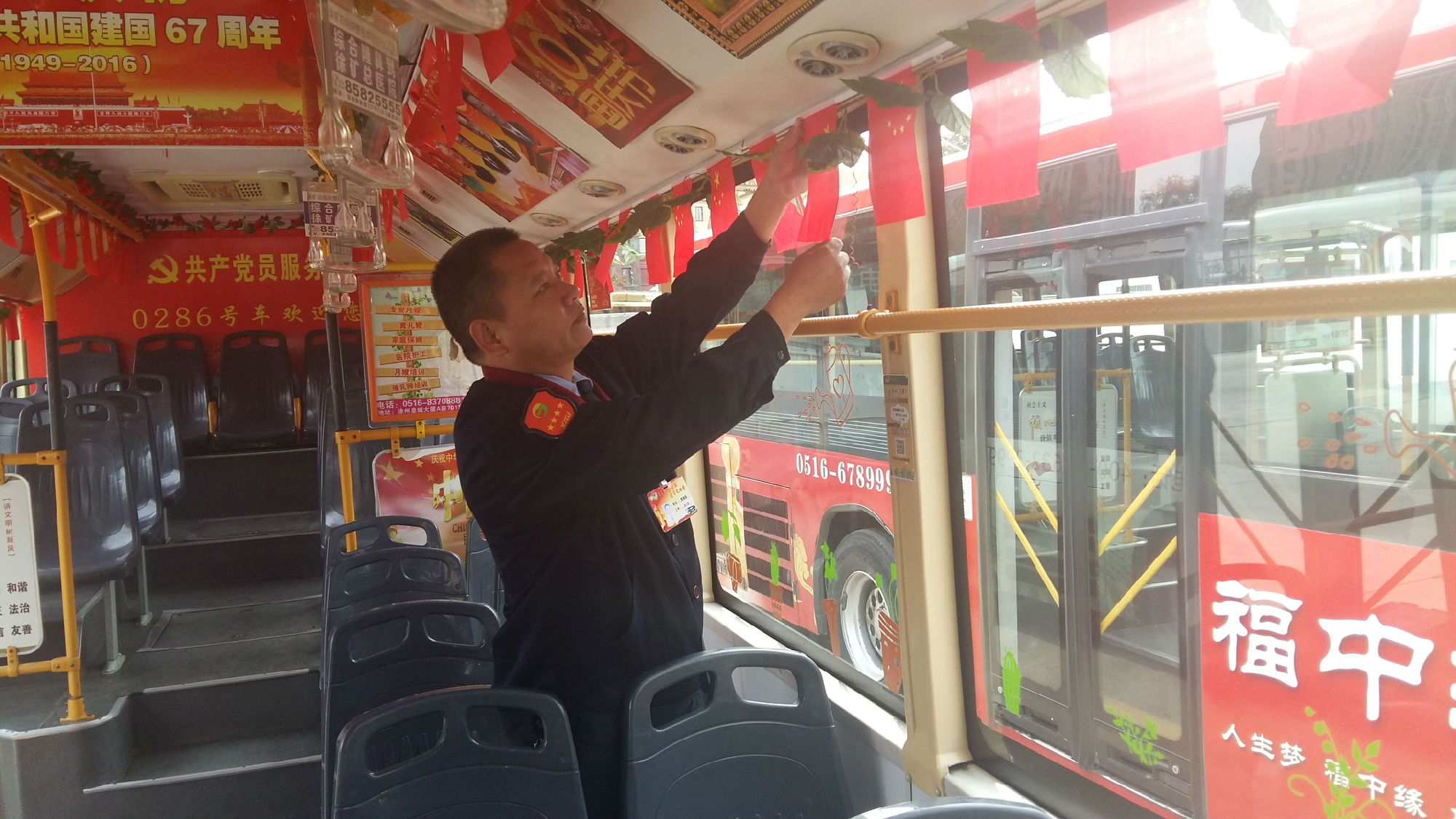 公交駕駛工作平凡、枯燥,但曹瑞國愛動(dòng)腦、喜創(chuàng)新,總會(huì)給乘客不一樣的驚喜,感受不一樣的出行服務(wù)。適逢節(jié)日、活動(dòng),他總會(huì)換著花樣地自掏腰包,給車上乘客一個(gè)驚喜:春節(jié),購置小紅燈籠掛滿整個(gè)車廂,給乘客帶來濃濃的年味;母親節(jié),他準(zhǔn)備了100支康乃馨、祝???,送給“媽媽級(jí)”女乘客,道上一聲由衷的問候;今年七一,為慶祝建黨95周年,他準(zhǔn)備了95面黨旗,95本黨章,以及黨徽、紀(jì)念章給乘客,并在車廂廣播入黨宣言、革命紅歌;9月22日宣傳世界無車日,他制作了10個(gè)卡通宣傳牌,加班安裝在車廂四周,號(hào)召市民選用綠色交通工具出行,減少城市污染;十一,他將一百面國旗掛在車廂內(nèi),被媒體稱為“國旗哥”;10月9日重陽節(jié),為老年乘客發(fā)放免費(fèi)鞋墊……