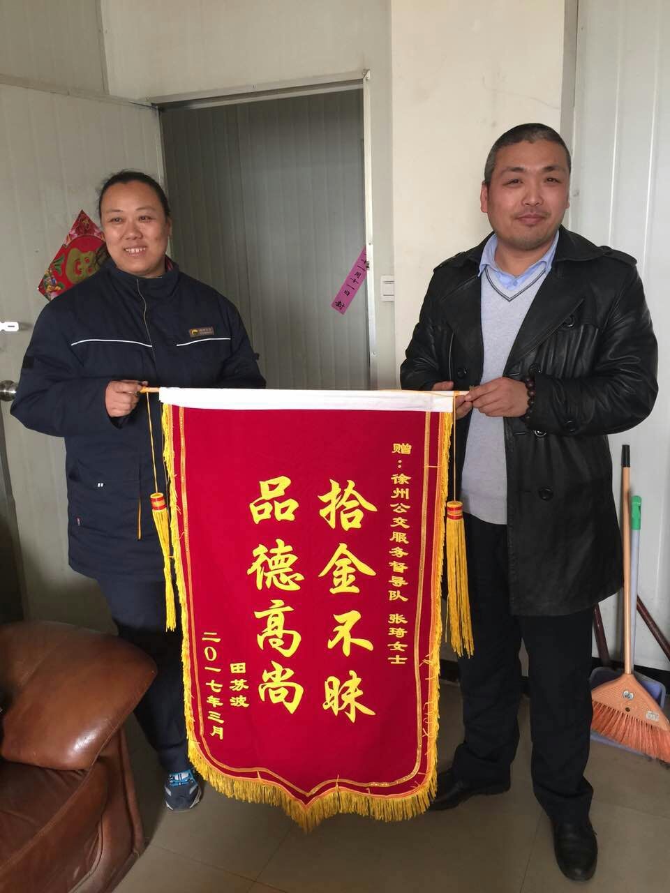 3月29日,正在站臺執(zhí)勤的督導員張琦撿到乘客掉落的公文包,經(jīng)查看發(fā)現(xiàn)包內(nèi)有蘋果筆記本一臺和一個錢包,但并沒有找到皮包主人的聯(lián)系方式。張琦把包放在了調(diào)度室等待失主來認領,約一小時后失主匆忙趕來尋找。失主見到失而復得的皮包非常激動,經(jīng)過詢問得知失主姓田在徐州礦業(yè)大學工作。田先生說,“電腦里存有非常重要的資料和聯(lián)系方式,丟包之后萬分焦急,真心感謝公交督導員。”隨即從錢包里拿出400元錢塞給張琦作為答謝,張琦表示:“路不拾遺本就是自己的義務,作為站臺督導員經(jīng)常會在站臺撿到乘客掉落的物品,不管東西貴重與否我們都會幫失主妥善保管等待認領?!?/span>3月31日,田先生和他的愛人送來錦旗表示感謝!