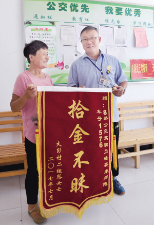 7月21日《都市晨報》A08版刊登了《急匆匆出門見朋友 3000多元現(xiàn)金遺失公交上》一文,講述了8路駕駛員潘要來拾金不昧的事跡。7月19日下午,家住銅山區(qū)大彭鎮(zhèn)的蔡女士從大彭鎮(zhèn)乘坐8路車到宣武,慌忙下車后,蔡女士忽然發(fā)現(xiàn)裝3000多元錢的布包不見了。兩人回憶,當(dāng)時忙著抱孩子了,把包遺失在了公交車上。蔡女士連忙回去,找到另外一名8路車駕駛員幫她聯(lián)系了8路調(diào)度室,很快傳來好消息:包找到了。原來,蔡女士乘坐的8路車駕駛員潘要來看到了座位上有一個東西,當(dāng)時他誤認(rèn)為是坐墊,后來,他看到有個乘客直接奔向那個座位,一屁股坐了下來,神色有些慌張。潘師傅從后視鏡看到,那個東西鼓鼓囊囊不像坐墊,便走了過去,將包拿回駕駛室。