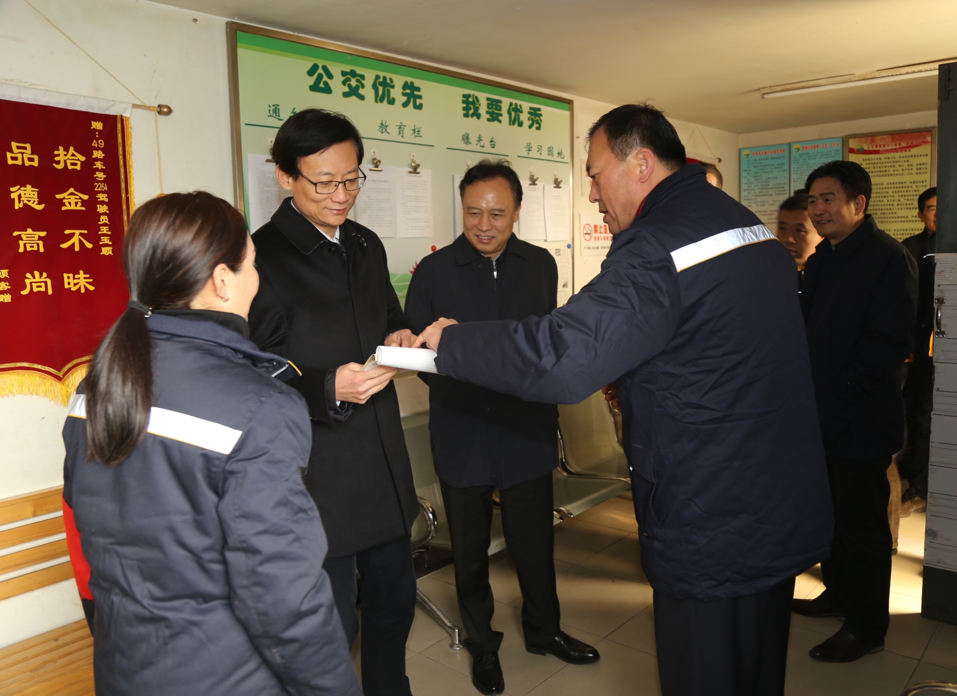 趙立群首先來到京徐公司76路、49路調度室,察看了調度室的工作環(huán)境和保暖措施,詳細詢問了駕駛員生產生活、用餐休息等情況。隨后,來到二級智能調度平臺,認真聽取了智能調度系統(tǒng)建設及運行情況,平臺工作人員現(xiàn)場演示了系統(tǒng)中運營調度、車輛定位、安全提示、實時監(jiān)控等操作,使其更直觀的了解智能調度系統(tǒng)的性能。最后,趙立群等一行又視察了保養(yǎng)車間,與修理人員進行了親切的交談。
