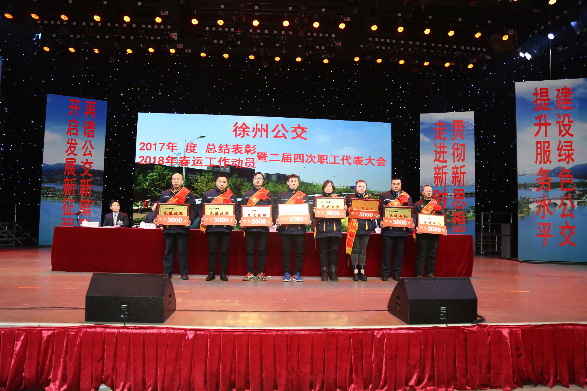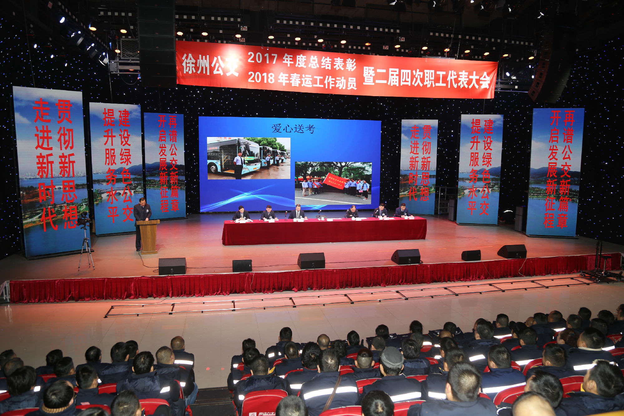 大會在莊嚴的國歌聲中拉開序幕。公司董事長、總經理杜紅軍首先作經理工作報告,對2017年“改革創(chuàng)新年”工作進行了全面總結:一、實施“同城同價”,優(yōu)化運營管理,實現(xiàn)服務水平新突破。連續(xù)第五年面向全市征集線路線網(wǎng)優(yōu)化意見近3000條,據(jù)此新辟優(yōu)化線路29條。二、深化資源共享,在互聯(lián)網(wǎng)+企業(yè)管理上譜寫新藍圖。繼續(xù)深化集中維修,推行集中例檢。論證實施支付寶、微信、銀行卡閃付等智能化移動支付方式。三、深化文明創(chuàng)建,打造優(yōu)秀公交,服務民生出行贏得新口碑。在國檢、省檢中未失一分,圓滿完成創(chuàng)建驗收任務。投訴總數(shù)和有責投訴同比實現(xiàn)“雙下降”。乘客表揚同比上升近20%。公司在2016年行風熱線上線單位滿意度評議投票中名列榜首。率先打造公交行業(yè)禮讓斑馬線嶄新形象,圓滿完成公交反恐防暴工作。四、著力綜合管理,聚合內生動能,增強企業(yè)發(fā)展新優(yōu)勢。重新修訂2012版管理制度匯編和新版《徐州公交獎懲條例》。五、踐行十九大精神,推進和諧發(fā)展,開創(chuàng)黨群工作新面貌。接著,杜總分析了工作中存在的問題,提出下步工作重點。一、建設現(xiàn)代化公交,提升經營管理水平,保障企業(yè)良性有序運行;二、踐行集約共享理念,深化科技應用,開創(chuàng)公交事業(yè)發(fā)展新局面;三、建設平安公交,提升服務口碑,展示文明公交新形象;四、踐行十九大精神,構建和諧公交,開啟黨群工作新面貌。